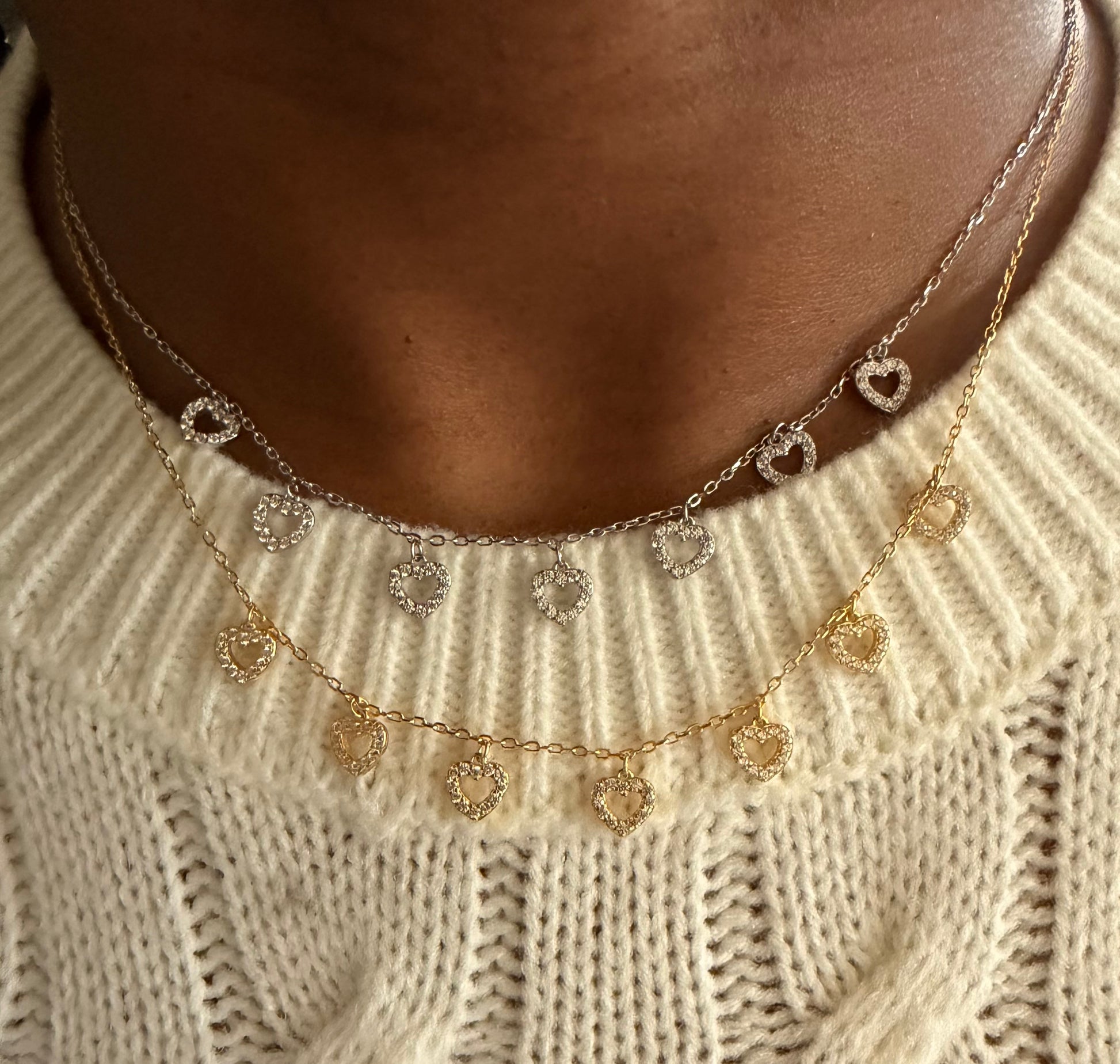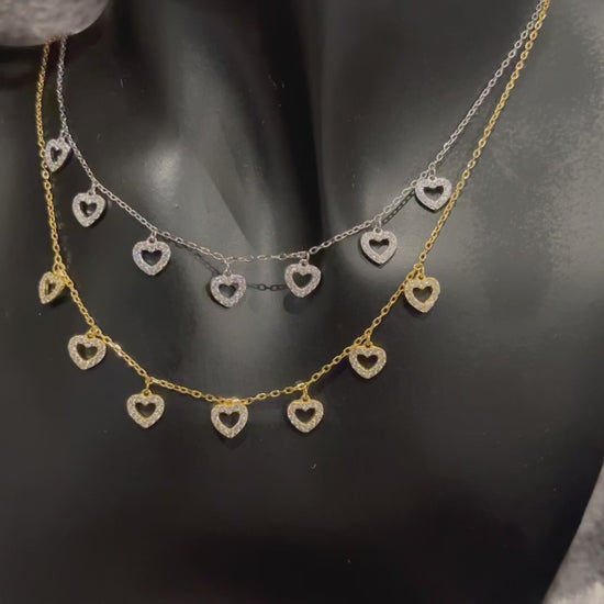 Add a touch of sparkle and elegance to your everyday style with our 925 Sterling Silver Heart Charm Necklace. Featuring a delicate chain adorned with shimmering open-heart pendants, this piece is perfect for layering or wearing on its own.